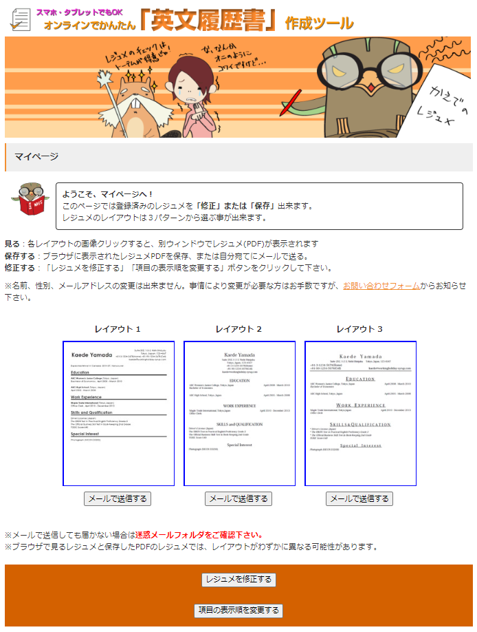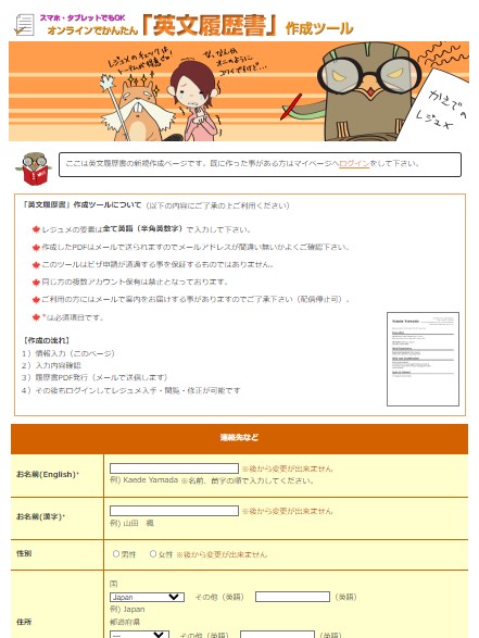 海外で就職活動で必要なレジュメ(履歴書)をいざ作るとき、何を書けばわからない!!っていう人も多いと思います。この 「英文履歴書」ツール を使えば、簡単な履歴書が作成でき、テンプレートとなるものがすぐに作れます。レイアウト(デザイン)は3つしかありませんが、その後、他のツールを使って自分のレジュメをアップグレードしていきましょう!
